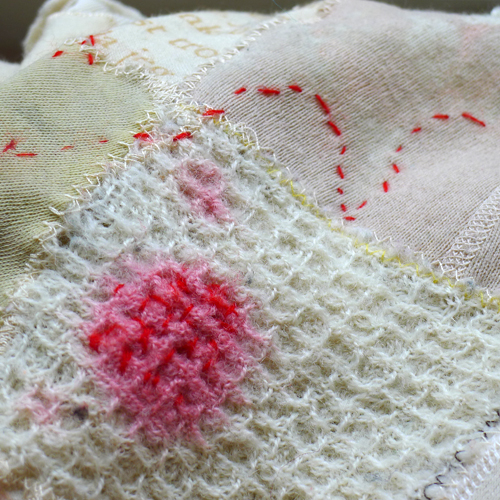 Enda et prosjekt fra min tid på Kunsthøgskolen i Bergen (KhiB). Jeg fikk en sekk med godt brukt ullundertøy fra Fretex som jeg klipte i biter, silketrykte og broderte på, og sydde sammen til et pledd.